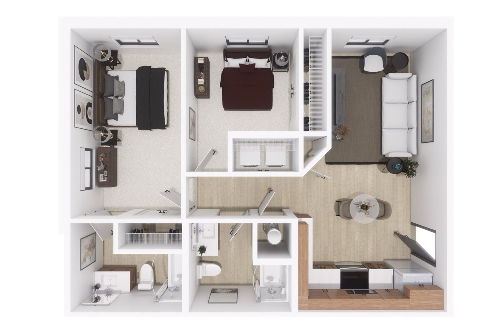 Odyssey’s apartments come fully furnished with private bedrooms and bathrooms, stainless steel appliances, quartz countertops, wood plank LVT flooring, modern cabinetry, and energy-efficient LED lighting. Each unit features stylish, high-end finishes designed for comfort and contemporary living.
