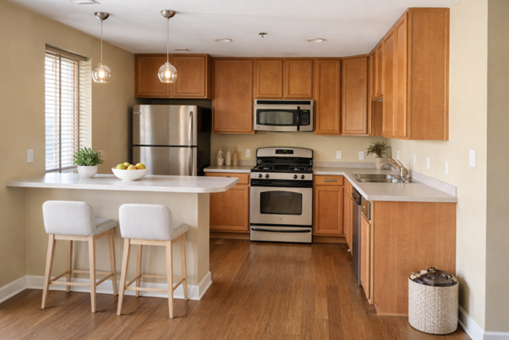 Inside the apartment you’ll find modern wood plank flooring throughout the main living areas, carpeted bedrooms, and an updated kitchen with stainless steel appliances and solid wood cabinetry. The units also include the convenience of in-unit washer and dryer, making everyday living easy.
